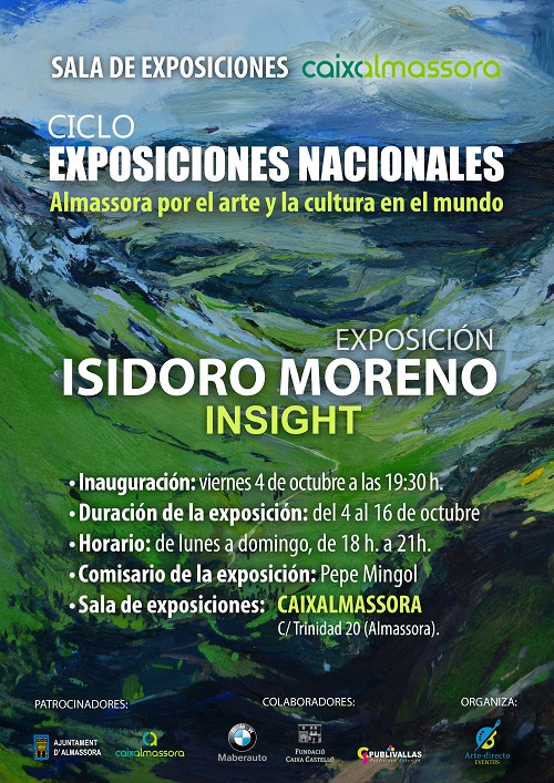 30/09/2019 - 10:02 EXPOSICIÓN DE PINTURA: ISIDORO MORENO Enviado por info el 30/09/2019 - 10:02 . Del 4 al 16 de octubre de 2019 - Salón de Exposiciones de Caixalmassora Horario: de lunes a domingo de 18 a 21 h. INAUGURACIÓN DÍA 4 DE OCTUBRE A LAS 19:30 HORAS