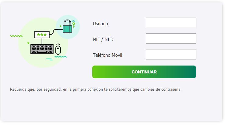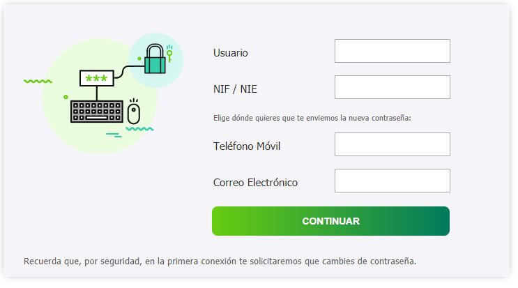 A continuación, introduce tu usuario y NIF/NIE e indícanos el teléfono móvil que tengas informado en la entidad para que te enviemos un SMS con tu nueva contraseña.