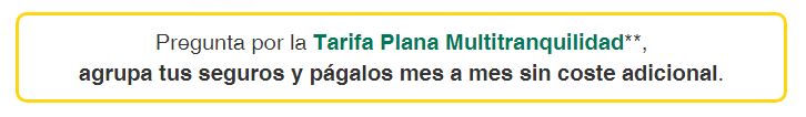 ** El Servicio de Tarifa Plana Multitranquilidad es un sistema para el aplazamiento en 12 meses que permitirá incluir cada seguro a su vencimiento o en la propia contratación y realizar el pago en 12 cuotas iguales, sin intereses, comisiones ni costes adicionales con una TAE del 0%. El servicio se instrumentará a través de una tarjeta de crédito virtual destinada exclusivamente a este fin, sin ningún coste de emisión ni mantenimiento. Para acceder al servicio, el importe total de los pagos netos anuales debe ser de al menos 240 €, el contratante del seguro debe ser titular de la financiación y la forma de pago de los contratos debe ser anual. Financiación sujeta a aprobación previa. El Servicio Tarifa Plana Multitranquilidad incluye: Seguros de Vida Riesgo contratados con RGA Rural Vida S.A. de Seguros y Reaseguros, con CIF A-78.229.663 y clave de la DGSFP C-595. Seguros de Hogar, Decesos, Accidentes, Comercio, Cazador e Incapacidad temporal contratados con RGA Seguros Generales Rural S.A. de Seguros y Reaseguros, con CIF A-78.524.683 y clave de la DGSFP C-616. Seguros de Automóvil contratados con: Liberty Seguros compañía de Seguros y reaseguros S.A. con CIF A-48037642 y clave de la DGSFP C-0467, Reale Seguros generales, S.A. con CIF A78520293 y clave de la DGSFP C-0613, y Mapfre España con CIF A-28141935 y clave de la DGSFP C-0058.