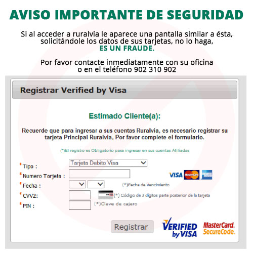 Hemos detectado una nueva forma de fraude a través de ruralvía, consistente en que una vez que el cliente entra con sus claves, le aparece una pantalla solicitándole número de tarjeta, fecha de caducidad, y el PIN de las tarjetas.